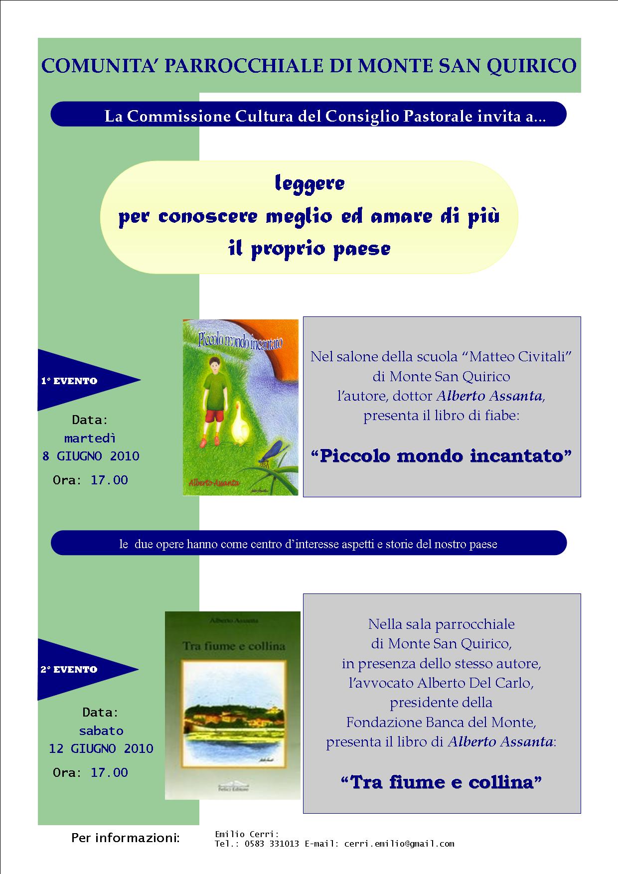 la lettura di due opere dello scrittore Alberto Assanta, medico pediatra, attualmente residente a Nodica in provincia di Pisa, ma nato a Monte San Quirico che attraverso i suoi testi letterari narra del suo paese di origine tramite fiabe, poesie e racconti.