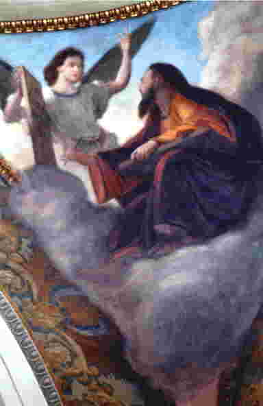 raffigurato con un angelo che porta un libro prezioso. Il suo racconto comincia
