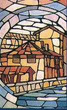 A fianco particolare della vetrata absidale di sinistra, rappresentante la facciata della Parrocchia.