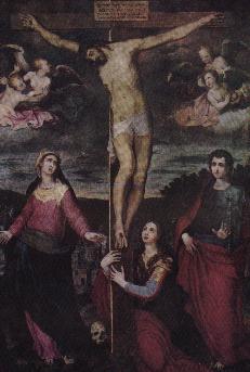 Attraverso il chiaroscuro, magistralmente dosato dal pennello dell'artista, si realizza sulle membra del Cristo un suggestivo effetto plastico-anatomico secondo la maniera dei grandi maestri del '500. Il sangue che fuoriesce a fiotti dal costato del Salvatore si staglia sul pallore dell'incarnato determinando un violento contrasto cromatico. Sulla destra è ritratto il discepolo prediletto di Gesù, Giovanni; in basso, la Maddalena che abbraccia il legno della croce e mostra un'espressione che è insieme di dolore e di contemplazione; sulla sinistra la Vergine Maria, sbilanciata verso l'estremità del dipinto in una posa sinuosa, contorta dalle onde della sofferenza. Il colore è una sinfonia di rosso e nero simboli del sangue e del dolore che sale dal basso fino ad un cielo d'ardesia, dove decanta in tutta la sua forza il dramma della morte. Ma là oltre la flebile striscia rosata dell'orizzonte simile ad un raggio di sole nel buio di un temporale, già si accende una consolante speranza di resurrezione.