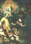 I protagonisti nella scena di questo dipinto sono i Santi Pietro, Antonio e Lorenzo. Non c'è una tradizione iconografica precisa che accomuni i tre Santi. Il fatto che si trovano insieme nell'opera è da legare presumibilmente ad una particolare devozione verso di essi della committenza. Si notino la palma nella mano di S. Lorenzo, simbolo della vittoria dei martiri, oltre che la graticola, strumento del suo martirio. Un angelo porge a S. Pietro le chiavi del Paradiso e il triregno in una trama simbolica che termina nel giglio che S. Antonio tiene nel palmo della sua mano, mera allusione a quei sentimenti di purezza e di innocenza che contraddistinsero la sua vita terrena nell'amore verso il Bambin Gesù. Le pose delle figure alquanto enfatiche e manierate assumono un'espressione meditativa e di preghiera, concentrati nella contemplazione del mistero del Dio fatto carne, raffigurato al centro del dipinto. Una giostra di angeli avvolge il Bambinello, adagiato su una nube in una vera esplosione luminosa che va a contrastare i toni scuri e fumati dell'intera composizione. L'opera è da ascrivere al XVIII-XIX sec.