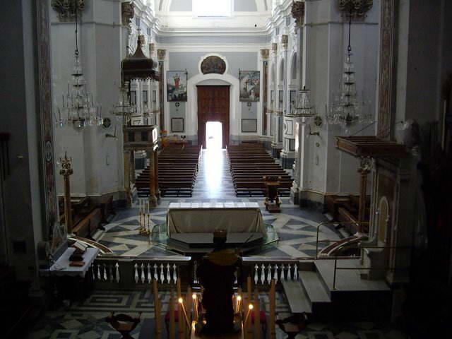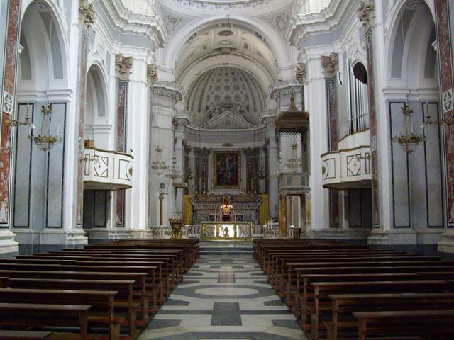 Molto elegante, articolata e ricca di effetti cromatici ottenuti da intarsi marmorei si presenta l'Altare maggiore.