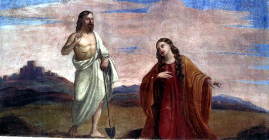 Su uno sfondo di paesaggio collinare, del quale sulla sinistra è visibile la cinta muraria di un castello o di un borgo, è rappresentata la scena dell'incontro di Gesù Cristo, coperto da un lungo drappo bianco che lascia scoperto il busto, e l'Adultera, inginnochiata ai suoi piedi con la mano destra al cuore ed il braccio sinistro alzato lateralmente. Essa veste una semplice tunica rossa ed un manto arancio ed ha il volto incorniciato da una lunga capigliatura appena mossa.