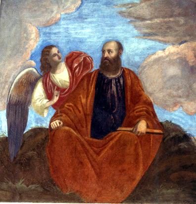 Il Santo, rappresentato assieme ad un angelo posto alle sue spalle sulla sinistra, si staglia su uno sfondo di cielo rosa e celeste ed è seduto su una protuberanza del terreno in cui sono evidenti vari ciuffi d'erba. Egli, che indossa una veste blu ed un manto arancio, sostiene sulle ginocchia e con la mano sinistra un libro mentre con l'altra mano regge una penna. Il volto, che incorniciato da una folta barba scura, è girato a guardare l'Angelo che sembra ammonirlo con l'indice della mano sinistra alzato. Quest'ultimo veste una tunica bianca ed un manto rosso.