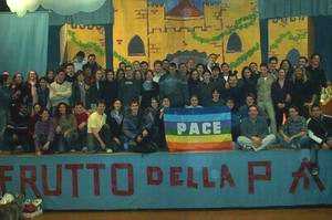 | Domenica 26 gennaio 2003 Questa domenica è stata dedicata alla Festa della Pace a livello vicariale. I ragazzi dell’ACR hanno vissuto un’esperienza di incontro e di festa con altri gruppi ACR del vicariato in uno stile di fraternità e di amicizia interrogandosi, attraverso attività mirate, sui loro stili di vita e scoprendo il consumo critico come strada di impegno per la Pace. Ci sono stati anche momenti di puro divertimento: abbiamo ballato, cantato, giocato. La festa si è conclusa con la celebrazione eucaristica dove abbiamo ringraziato il Signore per la bella giornata trascorsa assieme. Le foto rappresentano la bandiera colorata, sorretta da alcuni ragazzi e simbolo di questa giornata, e tutti gli animatori delle varie parrocchie che hanno reso possibile vivere questa giornata di amicizia. - gli animatori- |