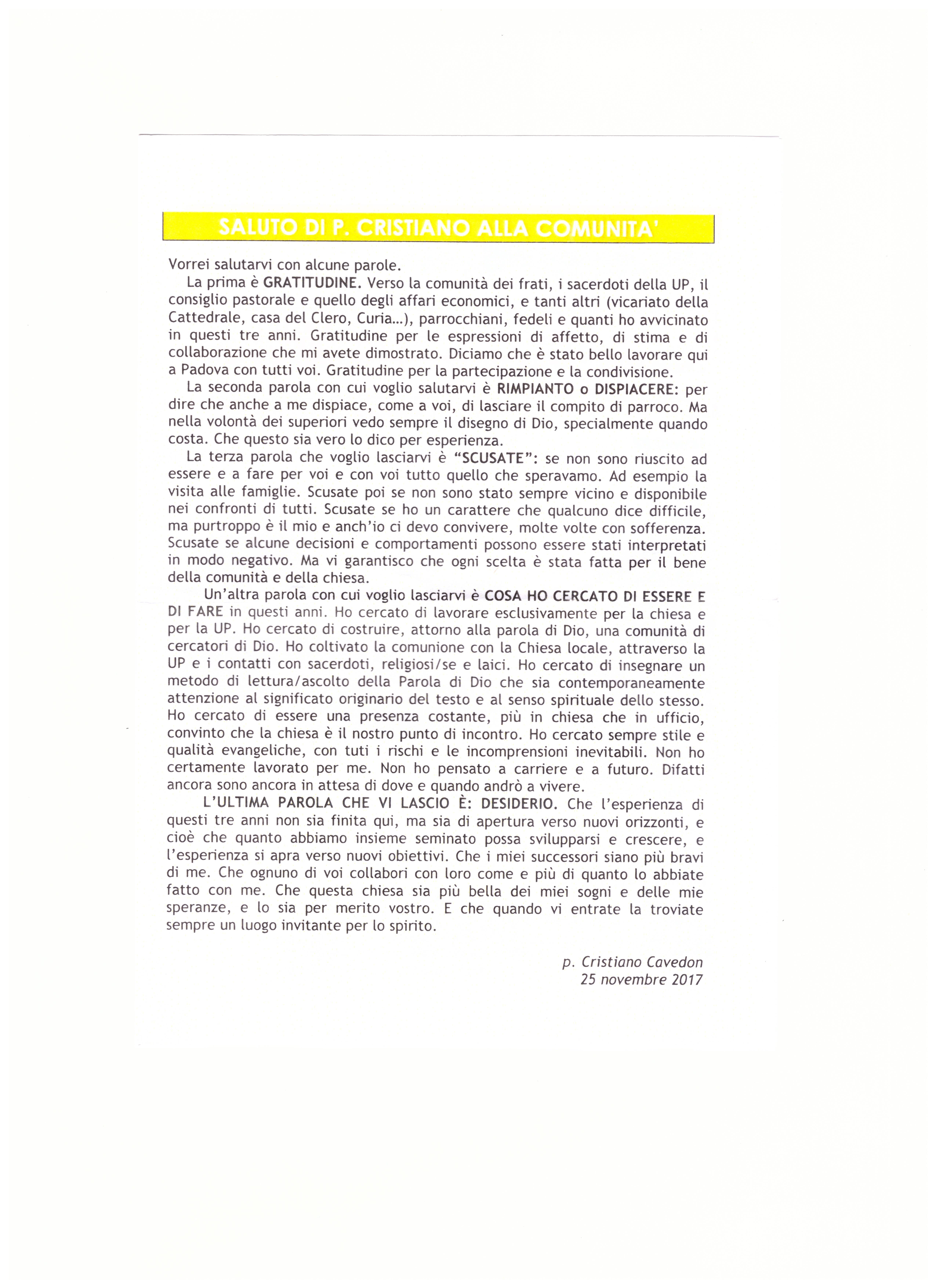 con la Pastorale cittadina, e da Padre Cristiano Cavedon con funzione di