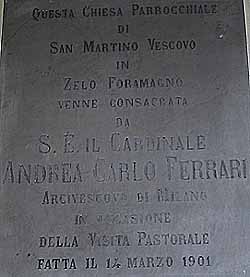 Vista della chiesa dalla piazza Nel centro di Zeloforamagno, l'antica "Agellum-Aziello" nominata sin dal Medioevo, vi è la bella chiesa dedicata a San Martino vescovo di Tours vissuto nel IV secolo. Venne eretta probabilmente durante la dominazione dei Franchi nel IX-X secolo, quando succedettero ai Longobardi. Dell'antico edificio della chiesa poco o nulla si conosce, se non che esso esisteva certamente già nel secolo XI, come attestato da documenti d'archivio. La chiesa venne riedificata nel 1519 con i fondi devoluti a tale scopo da Galeazzo Visconti, e più tardi nel 1581 divenne parrocchiale per volere di San Carlo Borromeo. L'attuale chiesa fu costruita nel 1692, utilizzando i muri perimetrali dell'edificio preesistente. Fu consacrata nel 1901 dall'arcivescovo Andrea C. Ferrari. Targa in memoria della consacrazione. Dal 1992 ha assunto il ruolo di chiesa sussidiaria in quanto la funzione di parrocchiale è passata al più grande edificio religioso intitolato a San Riccardo Pampuri. All'interno vi troviamo l'altare maggiore, degli inizi '800, in marmi misti (con parti provenienti dall'oratorio sconsacrato di Foromagno) sovrastato da un grande affresco raffigurante San Martino a cavallo. Altare maggiore Nella prima cappella laterale di sinistra si erge il battistero, sormontato da una stupenda, elaborata opera lignea del secolo scorso. Battistero Nella seconda cappella di sx vi troviamo l'altare dedicato alla Maria Vergine.