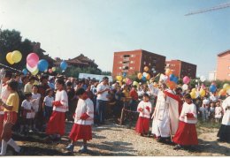 1968 In occasione della visita pastorale (27 Maggio) di S.E. il cardinale Giovanni Colombo si prende atto che la chiesa parrocchiale dedicata a S.Martino (ca 120 mq) è troppo piccola, sia rispetto al cresciuto numero di abitanti, sia in base ai progetti di espansione previsti dal PRG. 1970 Vengono acquistati ca 4.000 mq di terreno in una zona dove nel frattempo il PRG (Piano Regolatore Generale) l'ha destinato a verde attrezzato. Pertanto si è provveduto alla costruzione dell'Oratorio in luogo della Chiesa. 1977 Il comune individua in modo definitivo un'area ove poter costruire la futura Chiesa all'interno di un comparto destinati ad Edilizia Convenzionata (legge 167/62). 1985 Si da incarico al progettista Arch. G. Canella di predisporre una bozza di progetto che viene sottoposto a larga visione e approvato dall'apposita commissione del Consiglio Pastorale Parrocchiale. 1986 Posa della prima pietra (in marmo di Candoglia donato dal Duomo) alla presenza del Vicario Episcopale. ![]() Benedizione del Vicario Episcopale 1992 Vengono ultimati i lavori edili. Essendo la chiesa vuota internamente iniziano le iniziative per arredarla. Il 18 Ottobre la chiesa viene benedetta. Erano presenti Mons. Maggioni e Mons. Arosio responsabili dell'Ufficio Nuove Chiese della Diocesi. 1993 Seconda visita pastorale di S.E. il Cardinale Carlo Maria Martini. È presente anche il progettista Arch. Canella, tutte le autorità locali e i parenti di San Riccardo. 1996 Lo scultore Bentivegna consegna le stazioni della Via Crucis in ceramica. 1997 Vengono ultimati i lavori di copertura in porfido del piazzale circostante la chiesa. 1998 Consacrazione della Chiesa (26 settembre) per il ministero dell'Arcivescovo Card. Carlo Maria Martini. Viene presentato il progetto di ristrutturazione dell'Oratorio. |