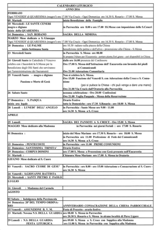 i links ai calendari specifici di ogni mese dell'Anno Liturgico 2016