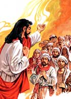 Vangelo - Gesù per farsi capire meglio, usa il termine più comune e semplice: il “pane”, che dà la vita al corpo fisico, ma Lui intende parlare di un altro pane,”il pane di vita eterna”:”Questo è il pane che discende dal cielo…io sono il pane vivo, disceso dal cielo …il pane che io darò è la mia carne per la vita del mondo”.