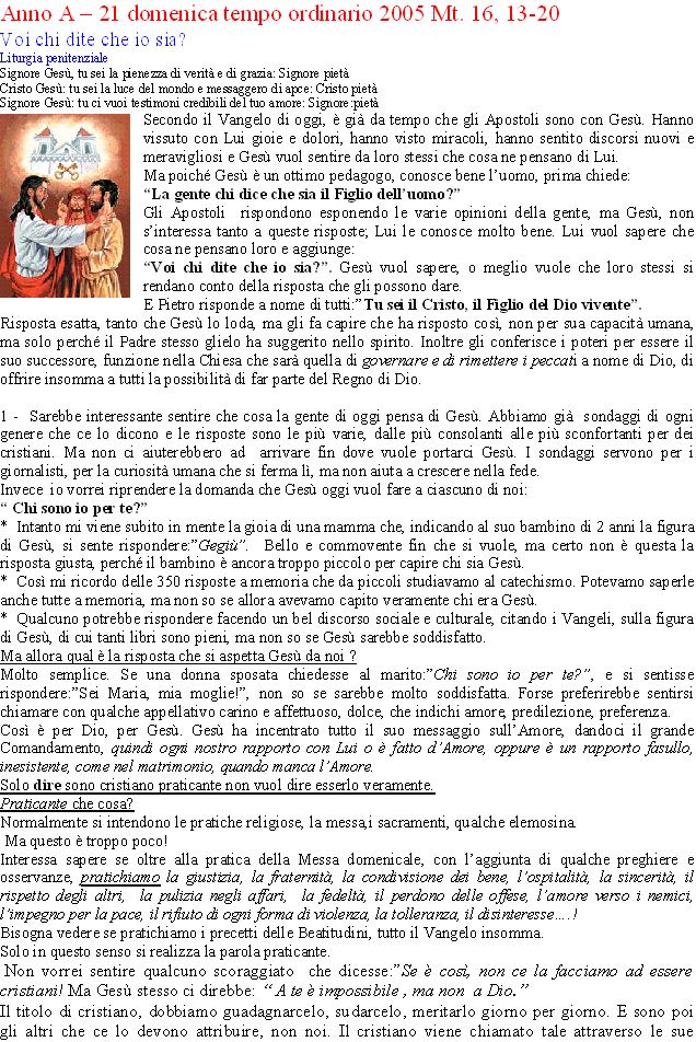 O Gesù, Figlio di Dio, aiutami a riconoscere sempre meglio la tua voce che, in mezzo alla confusione del mondo di oggi, parlando proprio al mio cuore, mi chiede:”Chi dici che io sia?”. Aiutami a sceglierti in ogni momento della mia vita , a seguirti pur in mezzo alle tante vie sbagliate che il mondo mi indica. Aiutami a risponderti con lo stesso entusiasmo e fede di Pietro:” Tu sei il Cristo, il Figlio del Dio vivente”. Concedimi oggi e sempre di conoscerti più chiaramente, di amarti più profondamente, di seguirti con più entusiasmo e volontà, perché Tu solo sei il mio Signore e il mio Dio. Amen: