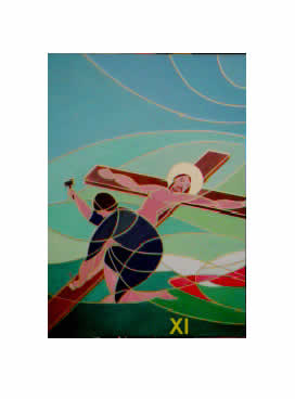 In questa undicesima stazione l'uomo che inchioda i piedi di Cristo, posto alla sinistra, diventa il punto di partenza della croce che, messa in diagonale, indirizza l'osservatore verso l'orizzonte; esso con la sua curva allude a tutto il mondo che abbandona Gesù.