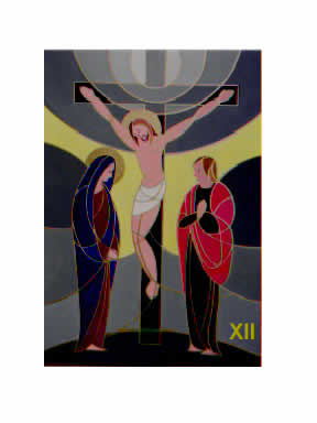 La dodicesima composizione è l'unica a impianto simmetrico per favorire il senso di immobilità. Gesù è morto in croce e tutto sembra essersi fermato, comprese le due figure ai lati di Cristo. Una grande luce si è spenta sulla terra e il paesaggio ne risente diventando acromatico. Il giallo-luce apre al centro la composizione e allude al padre che allarga le braccia per accogliere il figlio.
