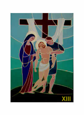 Cristo al centro della composizione, nella tredicesima stazione, è sollevato in verticale dalla figura di destra mentre la Madonna, vedendo il figlio nella posizione dei vivi, nutre ancora delle speranze di vederlo vivo e lo tocca per scorgere qualche segnale di vita.