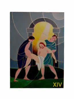 Dosati andamenti lineari costruiscono la composizione della quattordicesima stazione i cui personaggi sono colti con naturale scioltezza. Gesù è deposto nel sepolcro, visto non come un luogo chiuso, ma come una fonte di luce che indica la salvezza, dopo aver superato la porta del Vangelo di Giovanni: