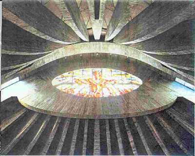InternoTutto il pavimento è inclinato secondo l'asse longitudinale, dall'ingresso principale - corrispondente al punto più alto - al vertice opposto ove è sistemato l'altare, sì che questo sia chiaramente visibile da tutti i punti dell'aula . I telai, tra loro paralleli, sono disposti, in pianta, lungo la diagonale trasversale della Chiesa, e tra loro distanziati di 2 metri circa, in modo da consentire l'illuminazione naturale attraverso due assole che corrono fra i telai lungo i lati inclinati. Alla estremità inferiore le travi rampanti appoggiano sulle pareti di perimetro attraverso una serie di pilastrini orientati ognuno nella giacitura verticale della trave corrispondente. Nelle ore diurne il finestrone convoglia la luce naturale direttamente sull'altare; e nelle ore notturne proietta all'esterno le luci della Chiesa, evidenziandone il ruolo o la presenza.
