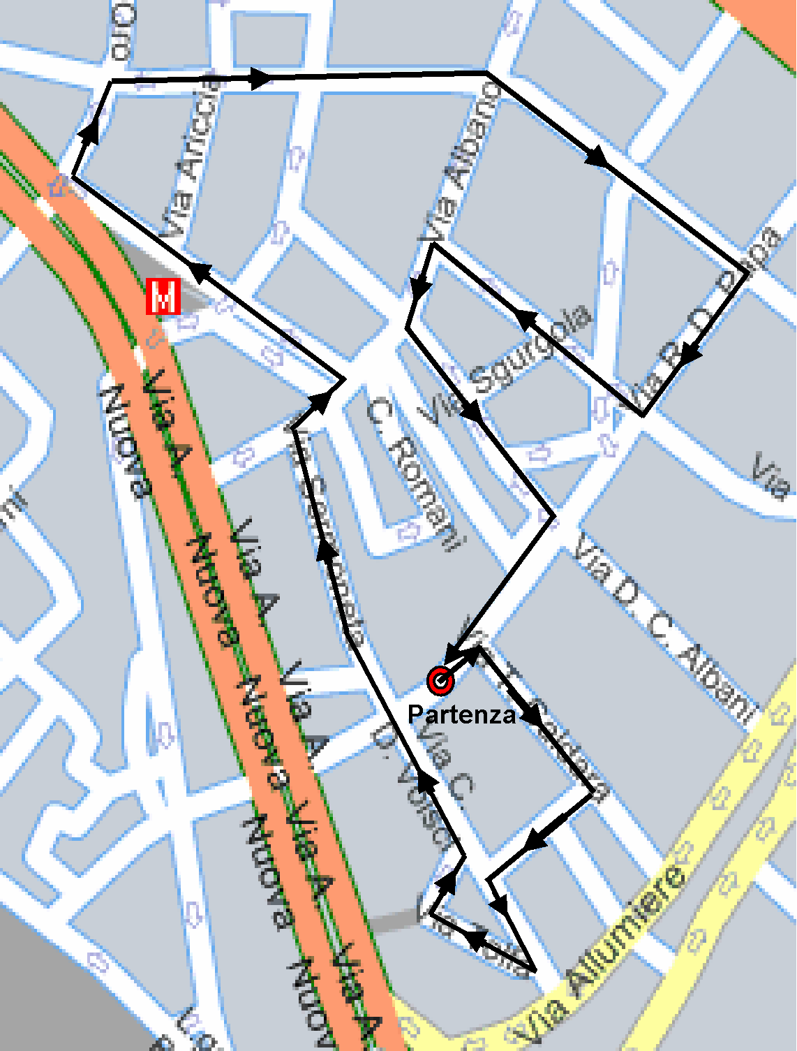 Partenza da Piazza San Gaspare Via Castro dei Volsci Via Rocca Gorga Via Tolfa Via Borgo Velino Via Tor Caldara Via Sermoneta Via Albano L.go dei Colli Albani Via Poggi DOro Via Genzano Via Rocca di Papa Via Acqua Donzella Via Albano Via dei Colli Albani Via Rocca di Papa Arrivo in Piazza S. Gaspare.