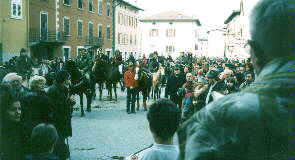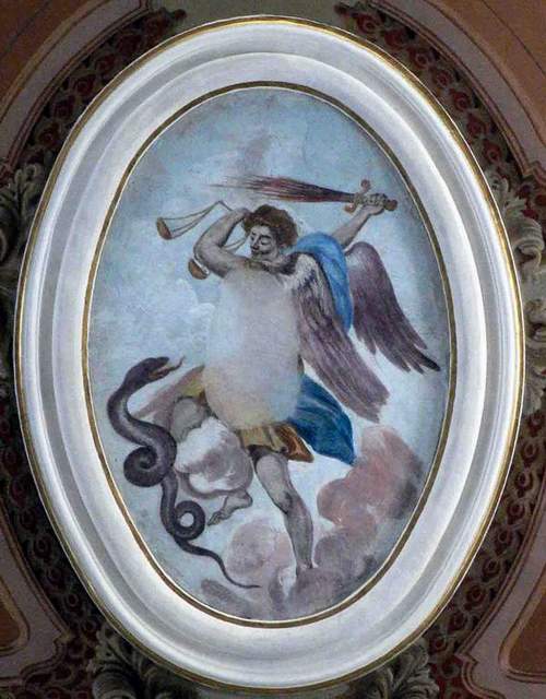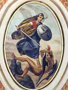 S NOTA: Nell'ultimo restauro della chiesa si è scoperto che il dipinto su tela di s.Michele (qui a destra) aveva coperto per molti anni il sottostante affresco più antico (a sinistra) nel quale era stato praticato un foro per far passare le corde che sostenevano la tela sottostante.