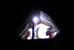 Gli operai, mentre saldano l'intelaiatura con la fiamma ossidrica.