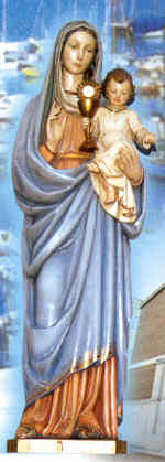 una statua con in braccio il bambino che porta nella mano il calice e l’ostia, segni dell’Eucaristia.