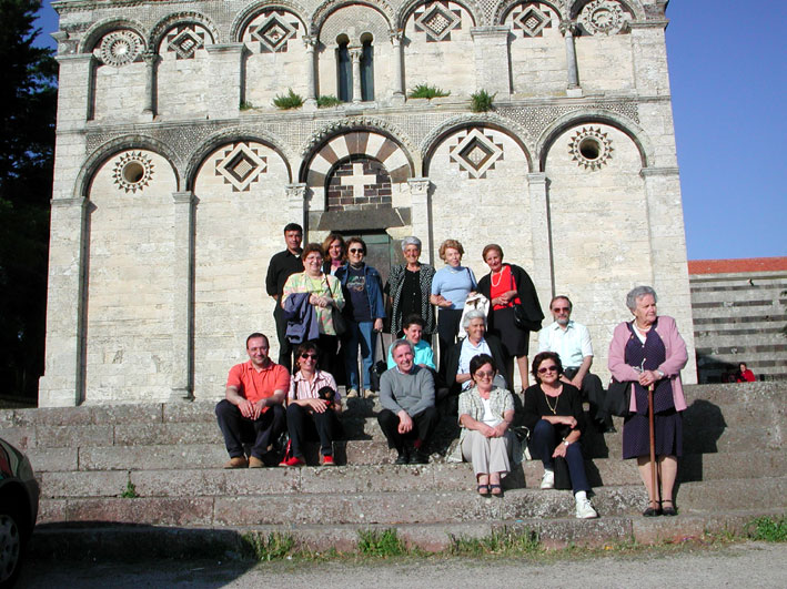 Alcuni partecipanti al pellegrinaggio mariano della parrocchia Cristo Redentore di Carbonazzi, davanti a San Pietro di Sorres (Borutta).