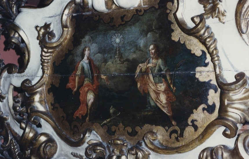 Sacrestia. Il locale della sacrestia, progettato durante i lavori settecenteschi, fu arricchito di un’armadiatura a parete che, come attesta da scritta incisa all’interno di un’anta, venne eseguita da maestranze locali nel 1761. Opera di discreto interesse, reca negli sportelli formelle mistilinee assai prossime per forma a quelle che ornano le specchiature alle porte minori della chiesa. Degna di nota è anche una splendida muta seicentesca di candelieri d’altare che fu donata, con ogni probabilità, dalla famiglia ducale. Alle pareti sono appesi alcuni dipinti risalenti ad epoche diverse mentre parte degli arredi e dell’argenteria è stata trasferita presso i locali della canonica dove è visibile solo su richiesta.