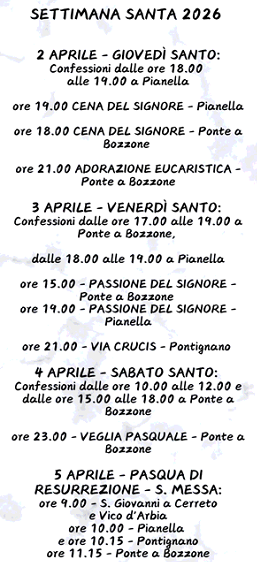 ‹‹Che è lei il nuovo parroco?››, ho sentito domandare in questi primi giorni di frequentazione, nei quali, anticipando un po' i tempi e d'accordo con Don Brunetto, ho iniziato a venire a dir messa nell'Unità Pastorale dei Santi Pietro e Paolo a Ponte a Bozzone. ‹‹Sì sono proprio io›› ho risposto ‹‹e mi auguro che ci troveremo bene insieme››.