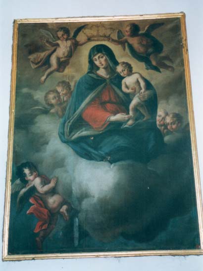 La pala centrale dell’altare maggiore era originariamente costituita da una grande tela ora sistemata nella prima campata di sinistra presso la porta d’ingresso, attribuita a fr. Francesco da Martina che rappresenta la Madonna col Bambino. In questo quadro, che oggi si presenta munito del sigillo napoleonico, il pittore raffigura la Vergine mentre stringe fra le braccia il Bambino. Dai capelli biondi e ricciuti, attorniata da angeli, di cui due reggono una corona. Come emerge dalla composizione e dai valori pittorici, nel presente lavoro fr. Francesco da Martina ha replicato nel disegno la figura della Madonna del Carmine da lui dipinta nelle chiese francescane di Castellaneta, di Mandria, di Soleto e di Mesagne. Sulla base dei dati cronologici relativi all’attività del pittore martinese, si può sostenere che esso si ricolleghi alle origini della chiesa francescana e che quindi sia stato commissionato pochi anni dopo il 1643.