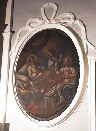 Sul lato di sinistra dell’abside dominano la t dominano la tela di S. Bonaventura con S. Ludovico di Tolosa del XVII che dai raffronti stilistici è da attribuire a fr. Giacomo da San Vito e due lunette laterali che raffigurano la Dormitio di S. Giuseppe e la Vergine col Bambino e anime purganti, del secolo XVIII.