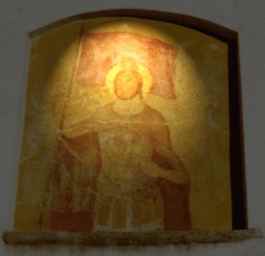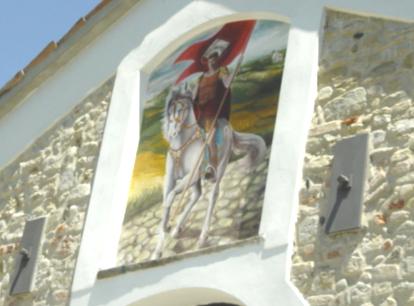 L'affresco che si trova sulla facciata della Chiesa Parrocchiale (rifacimento del 1990 fino al 2005) ci presenta il Santo come un soldato (si veda fig.1)