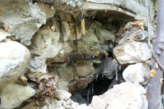2011.10.27 Apertura muro. Scoperta di enorme quantitativo di macerie all'interno. Il Direttore dei Lavori verifica lo stato di cedimento della platea soprastante (sagrato): si rileva un infossamento centrale di circa 10 cm rispetto alla linea degli spigoli (a sinistra e a destra). Questo aspetto è documentabile anche dai frequenti ristagni d'acqua, di neve o di foglie nella regione centro-occidentale del sagrato. Si osserva che le murature a contatto della platea sono fortemente imbibite d'umidità ascendente (muro canonica settentrionale, muro della chiesa). Il Direttore dei Lavori verifica lo stato del muro interno della canonica, confinante con la l'ambiente pieno di detriti (lato bagno ed antibagno): i muri portanti sono in fase di rigonfiamento per spinte orizzontali interne. Il processo di ribaltamento del muro divisorio in atto ha prodotto uno strapiombo verticale di circa 5 cm. Sintesi: il CEDIMENTO della PLATEA ha compresso i detriti interni che esercitano forze orizzontali sui muri esterni ed interni della canonica. |
