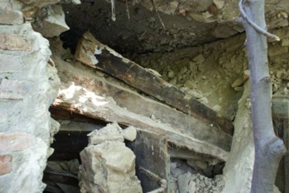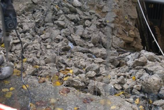 2011.11.09 La platea (così come il muro di tamponamento danneggiato ed appena demolito) si presenta fondata su uno strato di sabbia e rottami, e non su un supporto resistente (come sarebbe usuale) e su mura laterali molto precarie e mai consolidate. |