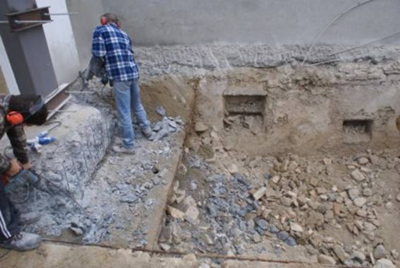 2011.11.10 Affiorano le costruzioni recenti (plinto 2002) a confronto con la platea: i ferri sono di dimensioni notevolmente maggiori rispetto a quelli della platea. (foto 07) |