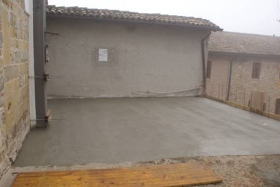 2011.10.28 - 2011.11.02 Analisi della situazione. La platea risulta composta da uno strato di calcestruzzo disomogeneo (verificato in opera durante la demolizione) spesso 20 cm e pesante ca. 17.000 kg, rispetto ad un'armatura molto debole (rete di ferro fi 4 mm arrugginita e risultata poi mancante in diversi punti). L'armatura è insufficiente a contrastare le forze orizzontali di trazione che si manifestano nella superficie inferiore della platea, a seguito del peso del calcestruzzo (= forze di compressione verticali esercitate dalla massa del conglomerato cementizio) e degli eventuali sovraccarichi (vetture, trattori, persone, ecc.). Ne consegue che la rete di ferro si è snervata allungandosi e rompendosi in più punti, consentendo il rilassamento verticale del calcestruzzo che si è appoggiato sulle macerie interne spingendole all'esterno contro i muri della canonica e del lato esterno. La pressione verticale esercitata sui rottami ha prodotto meccanismi di ribaltamento della muratura confinante a partire dall'alto verso il basso, poiché i muri antichi sono di norma più spessi al piede (e quindi maggiormente resistenti) che alla sommità . La situazione riscontrata presenta elevati livelli di danneggiamento del muro interno della canonica, con possibilità di sgretolamento e/o rottura della muratura stessa. Nell'ipotesi di mancanza di interventi significativi che eliminino le spinte orizzontali, si può configurare uno stato (immediato futuro) di distruzione del muro della canonica (con conseguente invasione dei detriti nei locali adiacenti e abbassamento immediato del loro livello all'interno del vano in cui sono dislocati) e crollo della platea soprastante. |