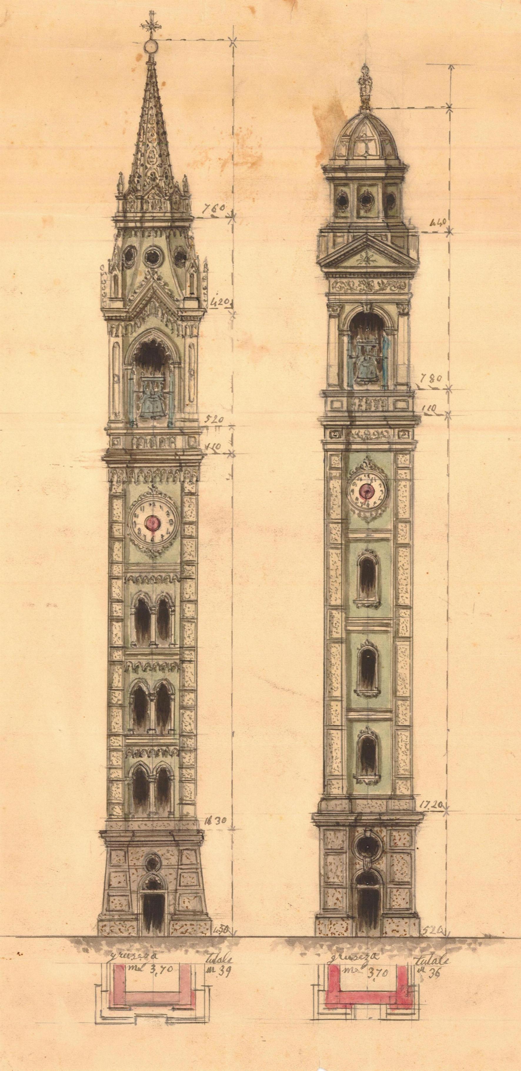 | Inizio costruzione campanile nuovo: il basamento e la guglia sono tratti dal bozzetto di sinistra; il fusto e la cella dal bozzetto di destra. | |