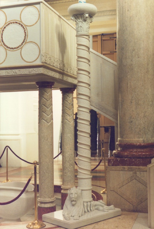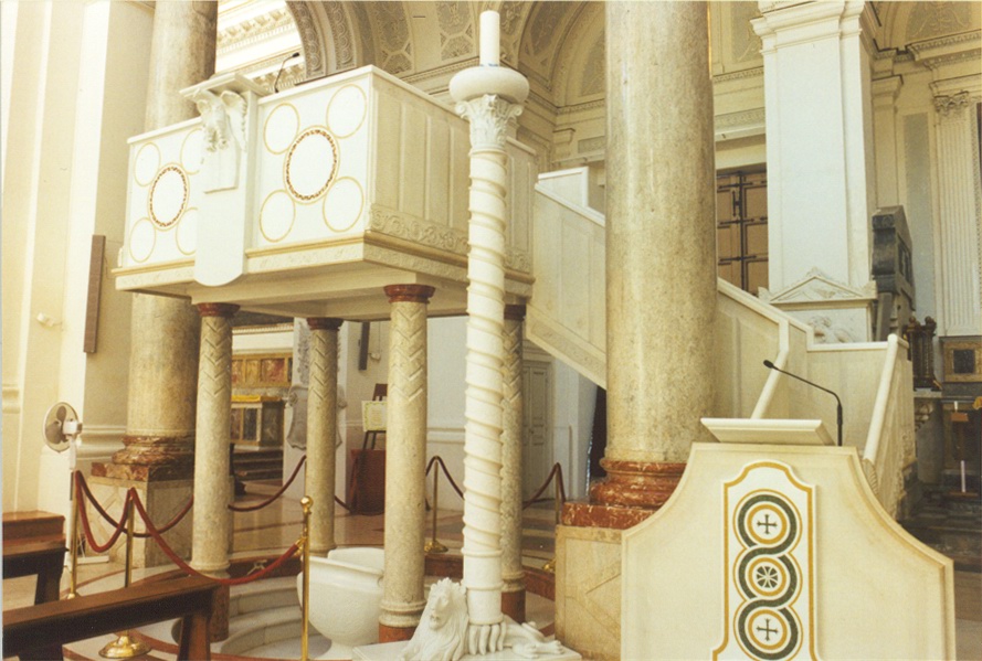 Il nuovo ambone, in pietra misca, presenta quattro colonne che sorreggono un piano di ca. 5 mq. cui si accede da una scala in massello di pietra giallo paglierino. Sotto il piano è sistemato il fonte battesimale in marmo bianco, posto a cm. 60 dal livello pavimentale, con tre gradini discendenti, simboleggianti la rinascita che il catecumeno effettuerà una volta compiuto il rito della morte e della risurrezione in Cristo. Questo luogo liturgico è completato da un candelabro di marmo bianco alto m. 3, simbolo della “Luce vera”, formato da un tortiglione scanalato con duplice lavorazione.