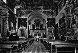 E' stato restaurato fra il 1989 e il 1991. Sopra la porta di ingresso, sostenuto da colonne capitello e barbacani gotici del XV secolo, si alza il "barco" o coro pensile per le monache.