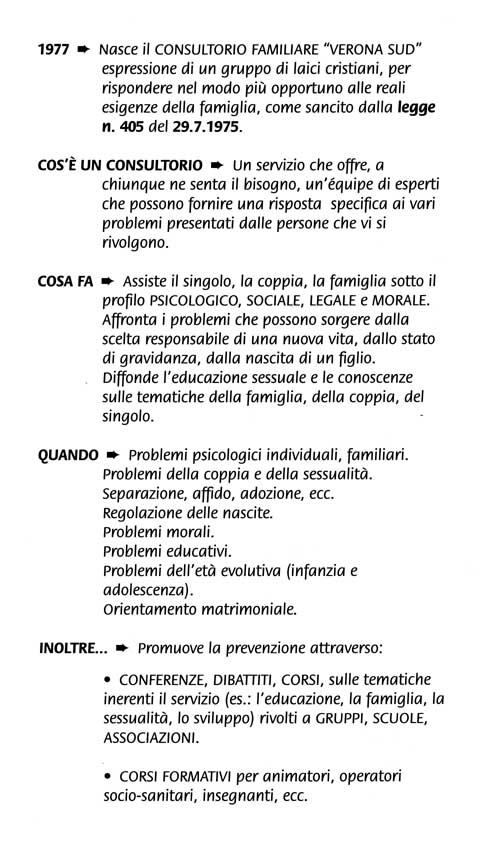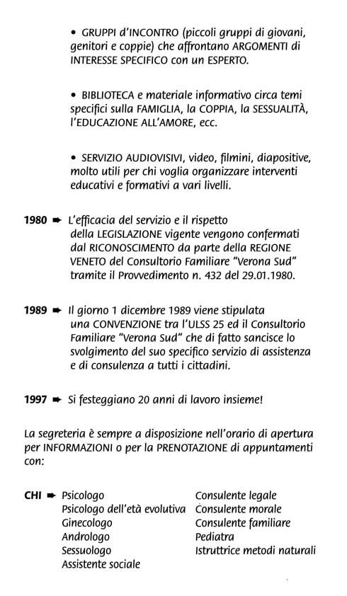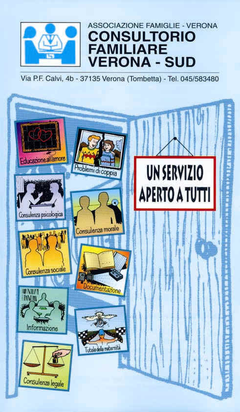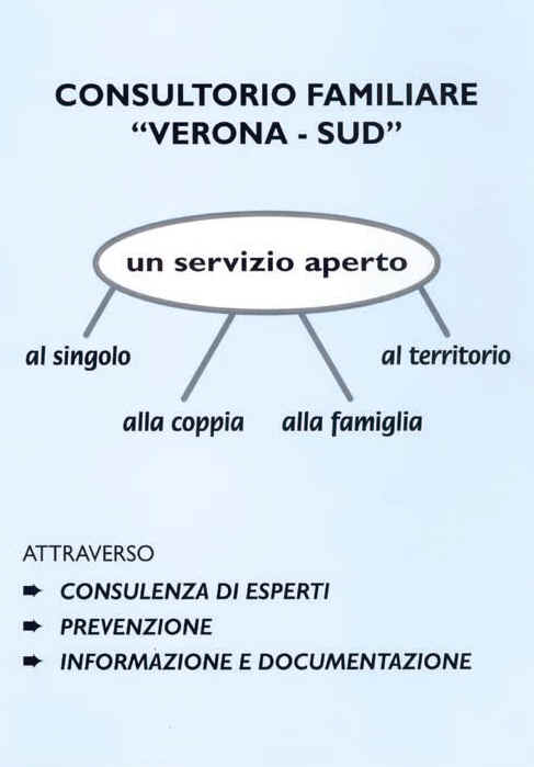 Chi siamo oggi Dopo 23 anni attività, il Consultorio Familiare 'Verona Sud" è oggi nel nostro territorio un'importante realtà a servizio della famiglia, della coppia, del singolo. Il consultorio mette a disposizione di chiunque ne senta il bisogno, un' equipe di esperti in grado di assistere le persone sotto il profilo psicologico, ginecologico, pediatrico, sociale, legale e morale. I servizi offerti, com'è noto, sono molteplici: dalle consulenze specifiche (per aiutare ad affrontare problemi della coppia, della sessualità, di separazione, di affido o adozione, di regolazione della fecondità, problemi educativi, ...), alle attività preventive e formative (incontri con gli adolescenti e i loro animatori, con gli educatori, con i genitori, con i fidanzati, nella parrocchie e nelle scuole). L'equipe del nostro consultorio è formata da un gruppo di 15 esperti, coordinati dal direttore, dottor Giampaolo Mazzara, con noi da molti anni. Sono professionisti, nei loro rispettivi ambiti, che hanno scelto liberamente di mettere a disposizione parte del loro tempo e delle loro capacità. AI consultorio vivono un'esperienza di condivisione e di servizio, a partire da una comune visione della vita e della persona umana, e fanno della relazione interpersonale la base del loro operare. Essi nori'lavorano mai singolarmente, ma "in sinergia", e nell'agire affrontano non tanto "i casi", ma hanno cura "della persona" che a loro si rivolge, e assieme alla persona elaborano pareri, consigli, soluzioni ai problemi.
