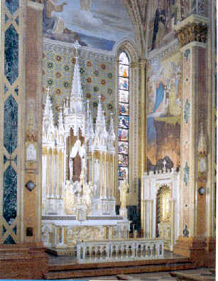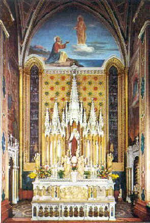 La mensa dell'Altare poggia, nella parte anteriore, sopra quattro colonnine di giallo Siena. Vi sono, parte per parte in basso dell'altare, due pannelli in bassorilievo raffiguranti due episodi della vita del Profeta Elia. Ai fianchi dell'altare due figure di Angeli, dal ricco paludamento in marmo di Carrara tinteggiato, reggono due lampade a piramide. Il pavimento in mosaico alla veneziana con arabeschi é di splendido effetto. La elegantissima balaustrata gotica, di scelti marmi, sorretta da colonnine in mosaico, ha fregi simbolici e sopra, in mosaico, la scritta: "E mostraci Gesù, il frutto del ventre tuo".