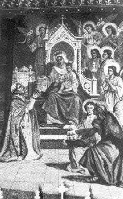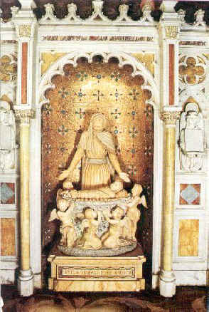 | É un omaggio dei Padri Carmelitani Scalzi e dei devoti del Carmelo alla "loro Madre", nella ricorrenza del VII Centenario dal dono dello Scapolare (1251 - 1951). Le magnifiche linee gotiche dei pinnacoli in marmo apuano svettano in alto sullo sfondo di un variopinto mosaico. Nella nicchia - tutta oro - si venera il Simulacro della Vergine in marmo statuario dai caratteristici colori della veste carmelitana: marrone e bianco. Il volto, sia della Madonna che del Bambino, e le estremità nude sono del bel marmo raro di Candoglia, adattissimo a dare, nel fresco color carnicino, una magnifica espressione naturalissima. Parte per parte della Madonna, su uno sfondo di mosaico - oro, si snoda una teoria di Santi e di Sante dell'Ordine Carmelitano. |
