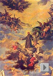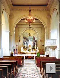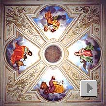 Una rara fotografia (per gentile concessione di Claudio Blarasin) del grande affresco, realizzato dal pittore Barazzutti di Gemona, che occupava l'intero soffitto della navata centrale, andato completamente e misteriosamente perduto durante i lavori di restauro dell'edificio, lesionato in seguito al sisma del 1976. La stranezza è che questa fotografia è stata scattata successivamente all'evento sismico e prima che iniziassero i lavori di recupero. Rappresentava la gloria di San Antonio e, secondo il Prof. Cesca, risultava di grande effetto: "le figure sembrano in piedi e gli scorci assai ben riusciti". |