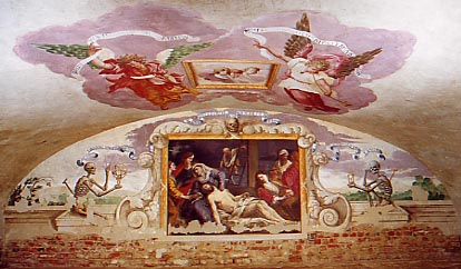 Questa scena, che si rifà sia iconograficamente che stilisticamente, anche nei colori, alla più celebre tela del Compianto del Cristo morto del Correggio, è racchiusa in una ricca cornice dipinta e presenta ai lati allegorie della morte in forma di scheletri reggenti clessidra, compasso e planetario. Il tutto sormontato da cartigli con scritte in latino.