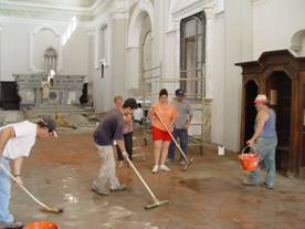 Le poche suppellettili superstiti (confessionali) vengono lavati, puliti e lucidati. Egualmente le antiche lapidi della chiesa vengono spolverate e lucidate.