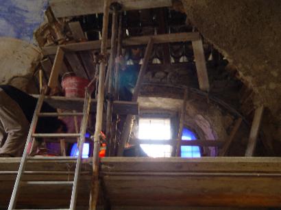 | Il voltino e parte della volta a crociera del coro riparati | Stesura rete d'acciaio per tutta la volta da consolidare e intonacare |