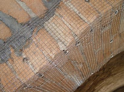 | Volta centrale: sutura fessure con TIXO T1 | Volta centrale: I campata - stesura cemento consolidante con rete d'acciaio |
