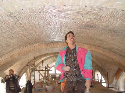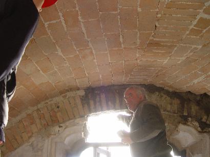 | Dettaglio fessura otturata con TIXO T1 e rete d'acciaio per intonaco consolidante | Alessandro Curti indica il voltino da riparare |