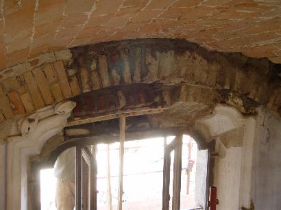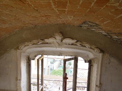 | La modanatura del voltino mirabilmente riparata da Alessandro Curti | La volta centrale intonacata |