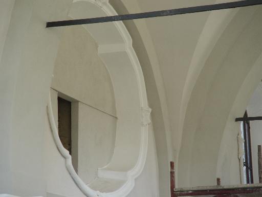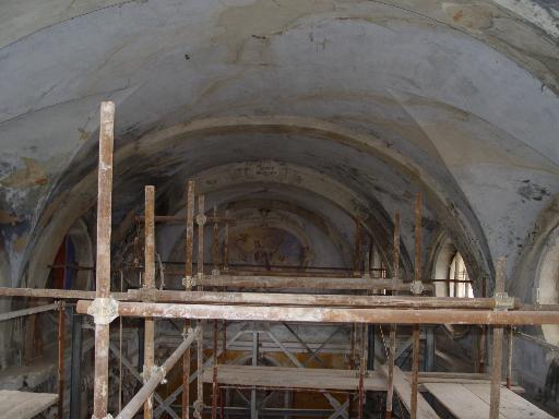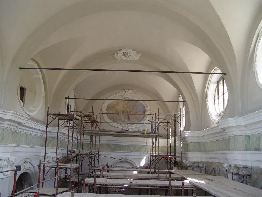 - Navata centrale - : Eliminazione dei ponteggi, restauro modanature, restauro affreschi, tinteggiatura completa