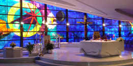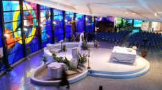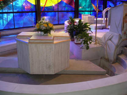 Fortemente caratterizzata da una forma a scendere verso l'altare, ha nelle particolari vetrate la sua caratteristica peculiare. Tali vetrate la cingono sui lati anteriori e posteriori, in modo da avere sempre illuminato il suo fulcro, l'altare.